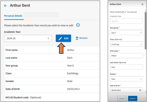 Here, you can make any changes you need to, such as changing their class allocation, or MIS number. Some changes will apply to all the previous years they’ve been added to CPI (like MIS number). Some changes will only apply to the selected academic year (like class allocation). Simply click “Edit” to access the editing panel and make the necessary changes.